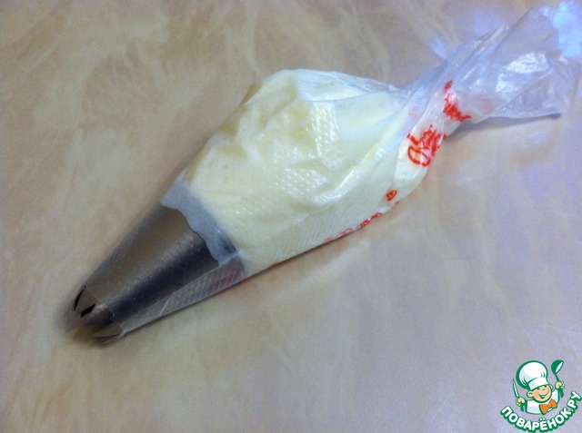Получившийся крем поместить в кондитерский мешок или просто в пакетик, в котором Вы срежете уголок. Отправить крем в холодильник.