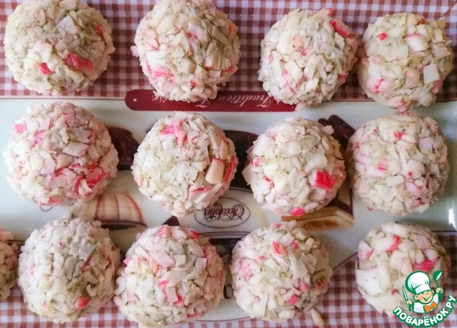 Формируем из массы шарики, обваливаем в крабовых палочках.