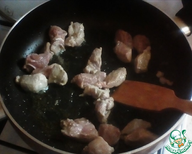 Разогреваем в сковороде оливковое масло, кладем кусочки свинины и обжариваем на сильном огне 5 минут.
