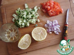 Овощи режем произвольно. Я порезала мелким кубиком. Масло оливковое соединяем с лимонным соком, который отожмём из 1/2 части лимона.