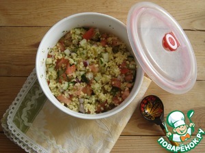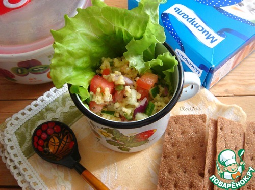 Очень вкусный салат. Я делаю такой салат с кус-кусом. С пшеном получилось ничуть не хуже! Попробуйте! Это полезно и не займёт много времени, что важно на участке или даче.