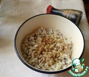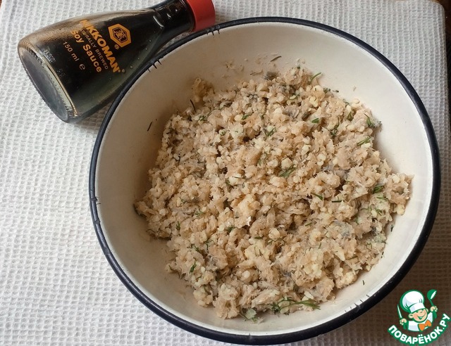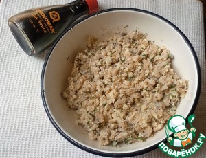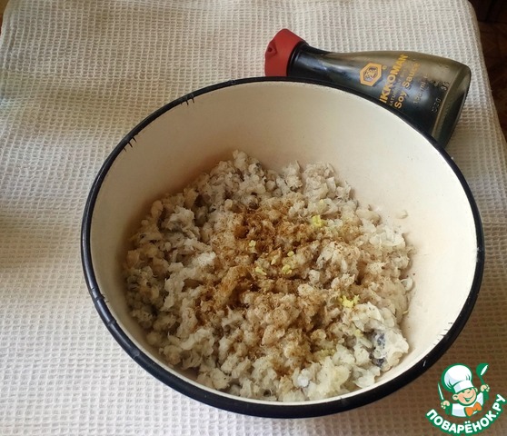 Рыбное филе перекрутить в мясорубке вместе с луком, добавить измельченный имбирь, кориандр и кумин. Влить соевый соус и поставить на 30 минут в холодильник.