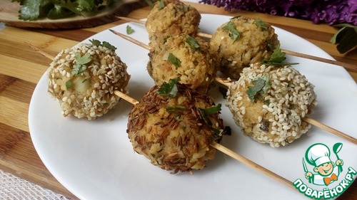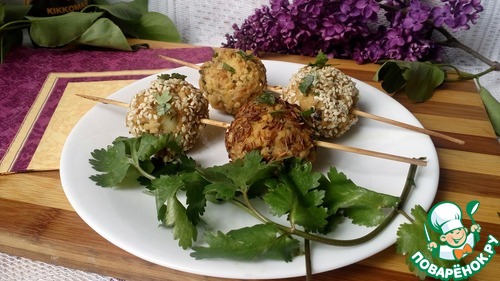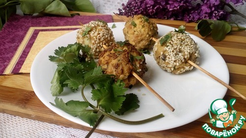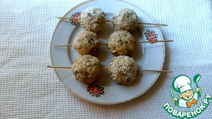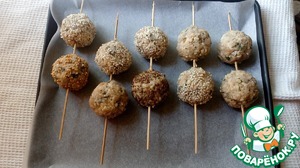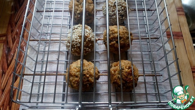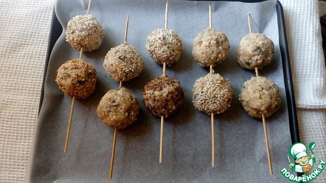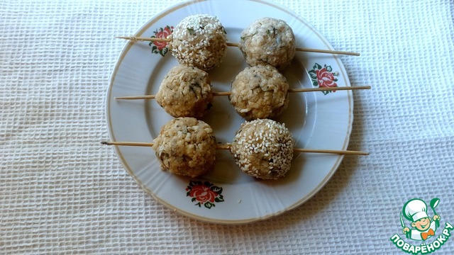 Обвалять в кунжуте (семенах кумина, горчицы ). Одеть на шпажки.