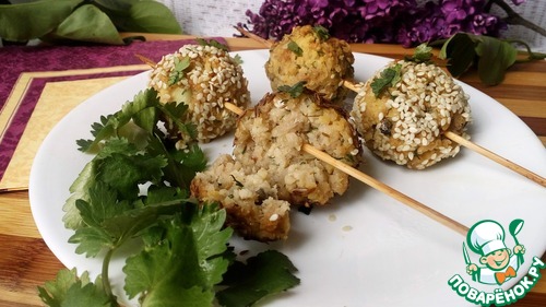 Моя дочка не любит рыбу, и я решила приготовить рыбные шарики с пшеном и надеть их на шпажки. Эксперимент удался - шарики были съедены!
