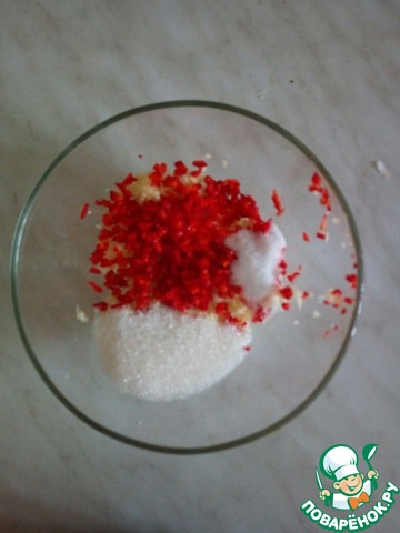 Готовим заправку. Чеснок и острый перец пропустить через мясорубку (я мелко нарезала руками, можно блендером), добавить соль, сахар и уксус.