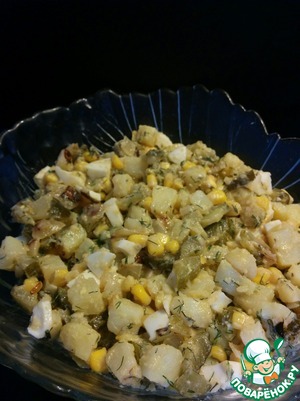 Яйца и огурцы нарезаем кубиками. Добавляем кукурузу, жаренный лук и мелко порезанный укроп.