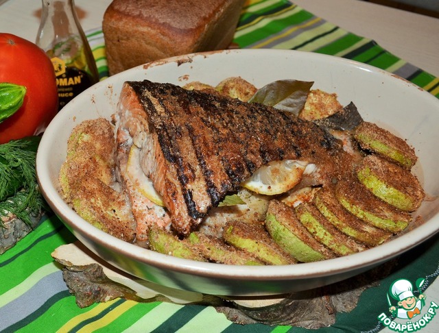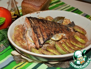 Обжаренную рыбу выложить в огнеупорную форму, обложить кабачками.