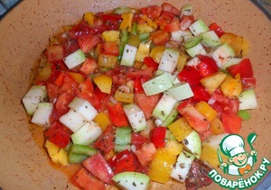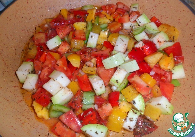 Нарезать все овощи кубиками по 1,5 см, чеснок мелко. Добавить масло, прованские травы, перец, соль. Перемешать