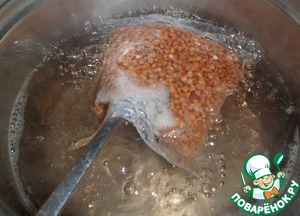 Поставить на огонь кастрюлю с 1 л воды. Как закипит, добавить пакет гречки и соль- ставим таймер на 20 минут.