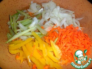 В оставшемся масле 2 ст. л. обжарить нарезанные соломкой перец и сельдерей, перьями нарезанный лук, натертую морковь.