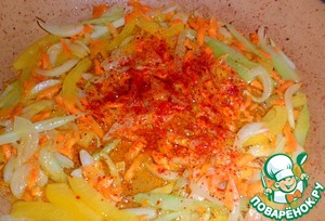 Добавить к овощам все оставшиеся специи: корицу, гвоздику, душистый перец, карри, острый перец, соль. Перемешать.