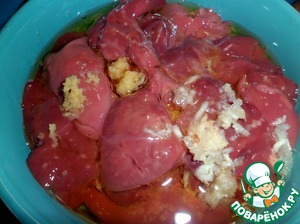 Замариновать печень на несколько минут, пока будем готовить овощи. Добавить к ней натертый свежий имбирь, чеснок. Влить оливковое масло, перемешать, отставить.