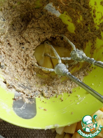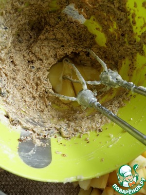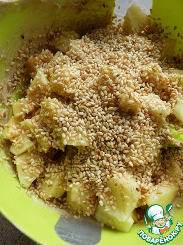 Яблоки очистить и нарезать средними кубиками. Добавить в тесто яблоки и кунжут, перемешать лопаткой.