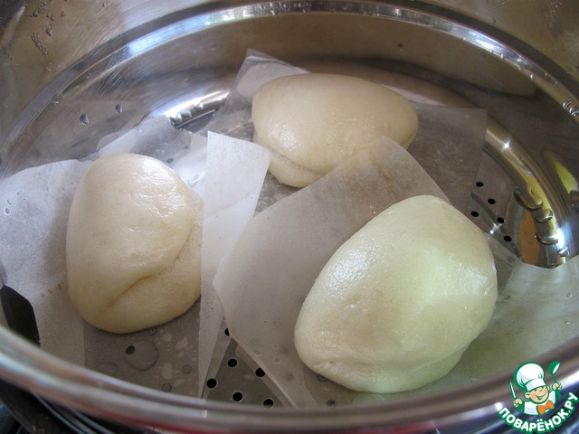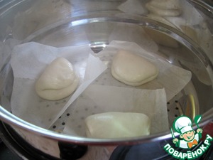 В кастрюлю залить воду, довести до кипения, поставить сетку для готовки на пару. Огонь минимальный. Булочки на бумаге перенести в пароварку и положить на расстоянии друг от друга. Накрыть крышкой и готовить 10 минут. Я могла бы взять двухъярусную пароварку или мультиварку, но в них очень интенсивный пар, а нам пар нужен очень умеренный. Можно использовать мантышницу. В ней процесс будет протекать гораздо быстрее.