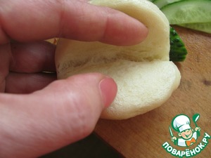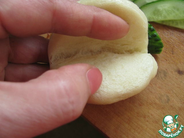 Готовые булочки можно заполнить любым ингредиентом и для этого их разрезать не нужно, а просто раздвинуть половинки пальцами.