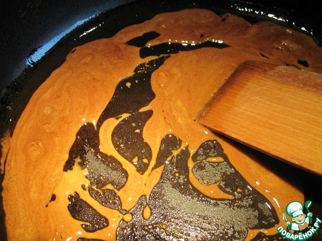 В сковороду налить масло (лучше, если это вок) и насыпать сахар. Сахар растопить.