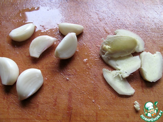 Чеснок и имбирь почистить. Имбирь порезать пластинками.