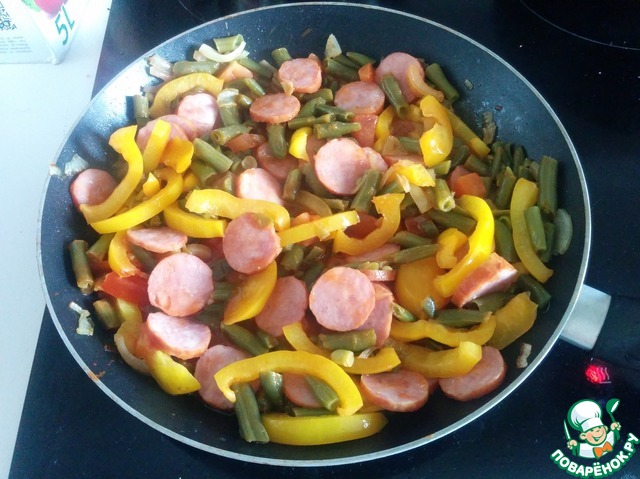 Добавляем стручковую фасоль, нарезанную колбасу, мелко порубленный чеснок и обжариваем все в течении 5 минут. В конце добавляем нарезанные мелким кубиком помидоры. Солим, перчим и жарим ещё минутку.