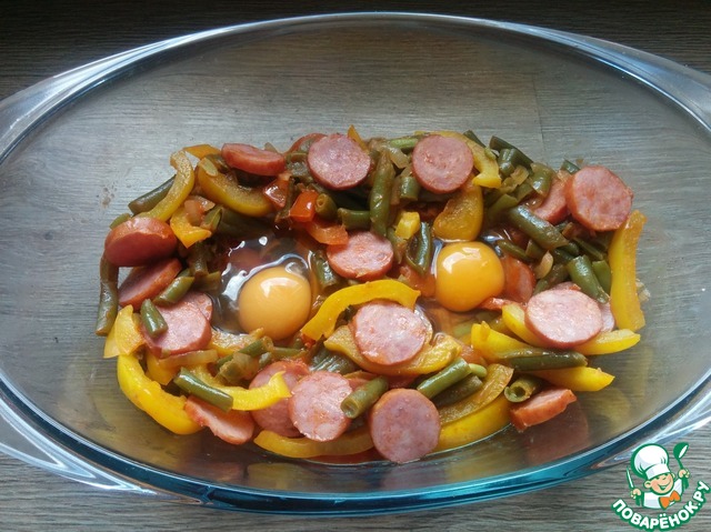 Приготовленные таким образом овощи перекладывем в жаропрочную посуду, делаем небольшие углубления и вбиваем туда яйца. Запекаем в разогретой до 180 градусов духовке 15 мин.