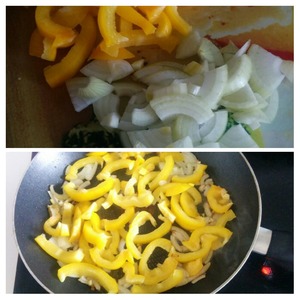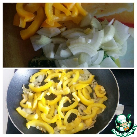 Лук и перец нарезаем и обжариваем в небольшом количестве растительного масла.