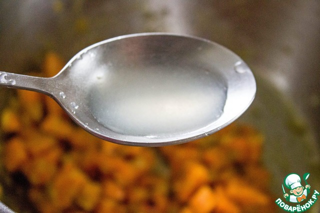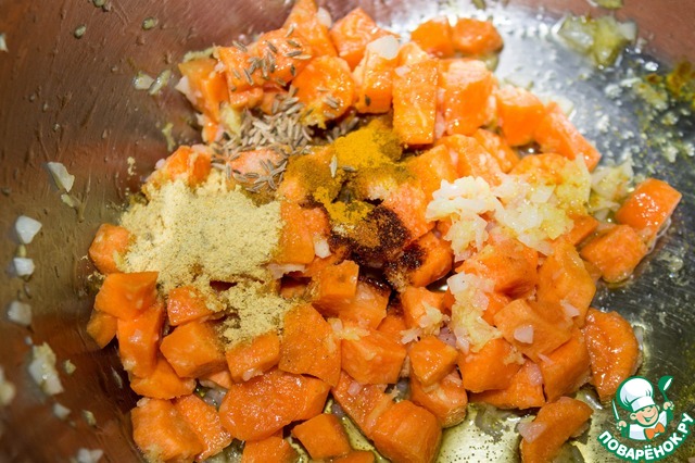 Снимаем кастрюлю с огня и добавляем сухие специи-перец чили, куркуму, порошок горчицы, зиру. Тщательно перемешиваем и чуть остужаем.