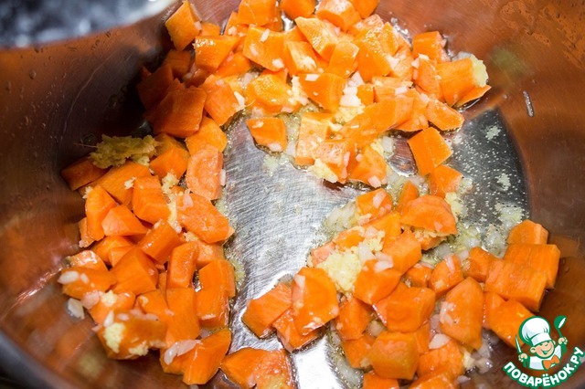 В нагретое масло выкладываем морковь, тертый имбирь, порубленный чеснок и пару раз перемешиваем, держа на огне.