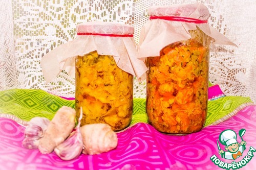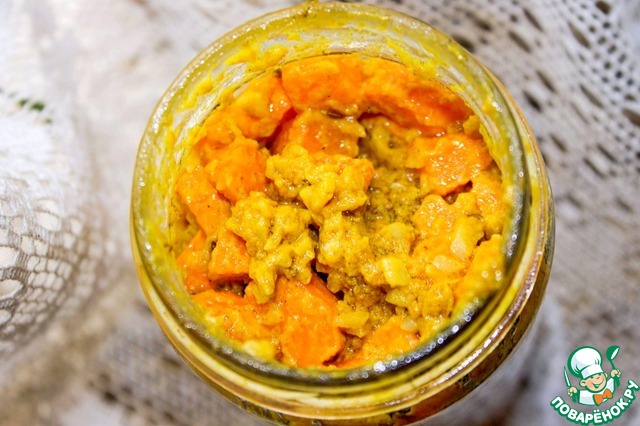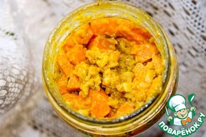 В теплую морковь добавляем лимонный сок и перемешиваем. Даем смеси настояться часов 12 при комнатной температуре, потом раскладываем по баночкам и убираем в холодильник.