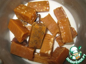 В небольшую кастрюлю налить сливки и выложить конфеты "Коровка" (у меня были ассорти с разными добавками: маком, кунжутом, кофе и т. д.), поставить на средний огонь и, постоянно помешивая, полностью растопить конфеты. Для ускорения процесса конфеты можно нарезать, но я не смогла, т. к. они были очень твердые (можно даже сказать "дубовые").