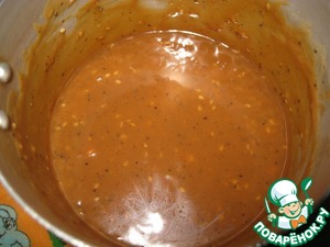 Получается жидковатая масса. Убираем кастрюлю с плиты и оставляем массу немного остыть прямо в кастрюле (при остывании она немного загустеет). Тем временем переходим к подготовке других составляющих для нашего десерта.