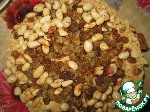 В глубокую миску выложить крошку из печенья и орехов, подготовленный изюм и оставшуюся половину орехов.
