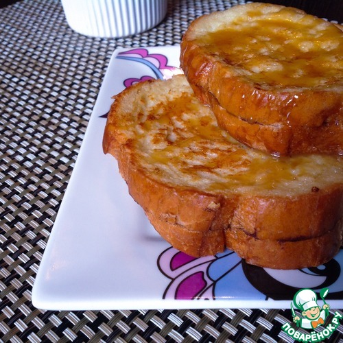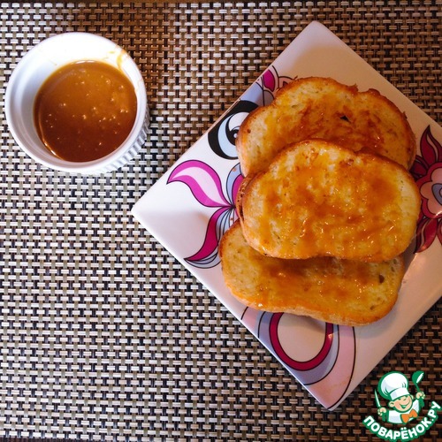 В сковород разогреть масло растительное или сливочное. Обмакнуть кусочки батона с обеих сторон в яично-молочную смесь и выложить в сковороду. Жарить на среднем огне до золотистого цвета с одной стороны, затем осторожно перевернуть на другую сторону, огонь убавить и жарить ещё 2...3 минуты. Готовые гренки выложить на тарелку и полить карамельным сиропом. Приятного аппетита!