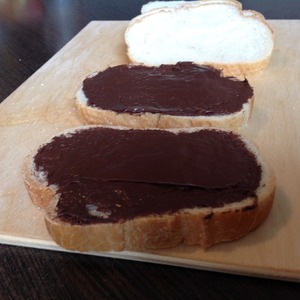 Густо намазать нутеллу на половину ломтиков. Сверху прикрыть оставшимися кусочками батона, слегка прижать.
