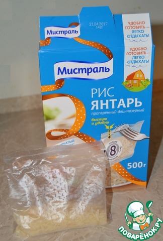 В кипящую подсоленную воду кладем пакетик с рисом, варим 30 минут. Затем вынимаем и даем немного стечь.