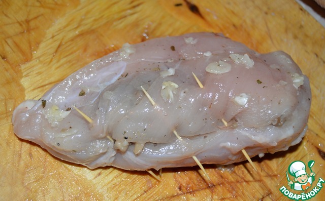 Куриное филе надрезаем в виде кармашка. Солим, перчим и смазываем измельченным чесноком со всех сторон и внутри кармашка. Начиняем грибами.
