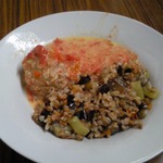 Баклажан нарежем кубиками, посолим. Лук мелко нарежем. Разогреем сковороду с оливковым маслом. Отожмем руками баклажаны от влаги - так они не будут впитывать в себя много масла. Баклажаны и лук потушим на среднем огне.