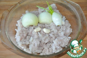 Для приготовления берём фарш рыбный по желанию и наличию, у меня из минтая. Добавляем измельчённые с помощью блендера лук и чеснок. Если у вас рыбное филе, то соответственно перекручиваете одновременно филе, лук и чеснок.