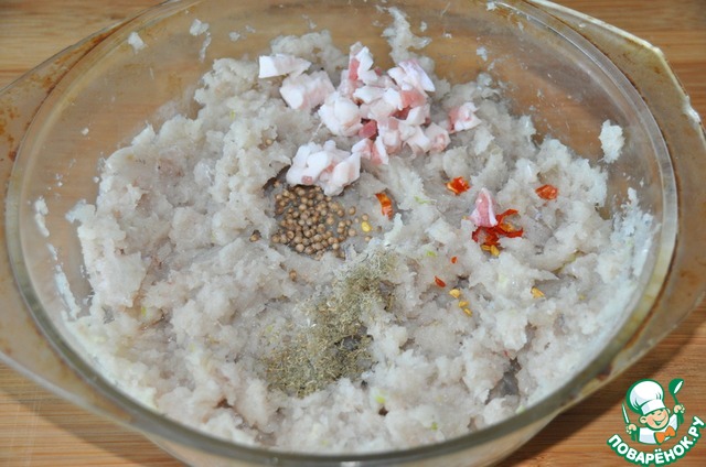 Добавляем к фаршу очень мелко нарезанный сыро-копчёный бекон, сухой укроп, хлопья перца чили, зёрна кориандра.