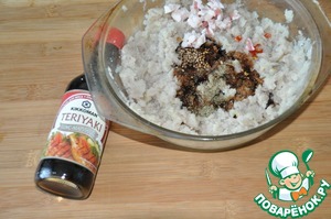 Наливаем соевый соус. У меня соус-маринад Teriyaki Kikkoman.