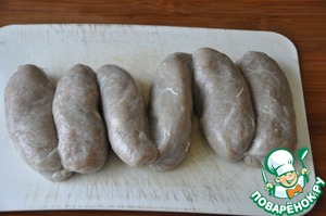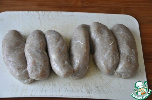 Выпускаем воздух, завязываем конец кишки ниткой. Через каждые 10-12 см перекручиваем колбаски. В конце также завязываем.