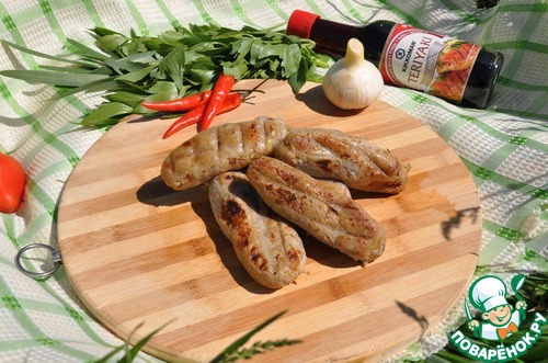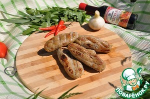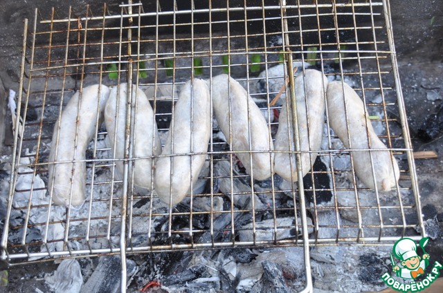 Готовые колбаски запекаем на решётке на углях мангала, периодически поворачивая, чтобы они подрумянились со всех сторон. Общее время около 20 минут.