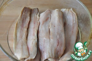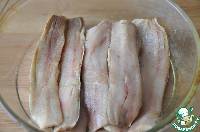 Берём сельдь, разделываем на филе без костей, но с кожей.