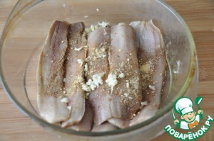 Посыпаем филе молотым кориандром, имбирём, хлопьями перца чили, выдавливаем чеснок.