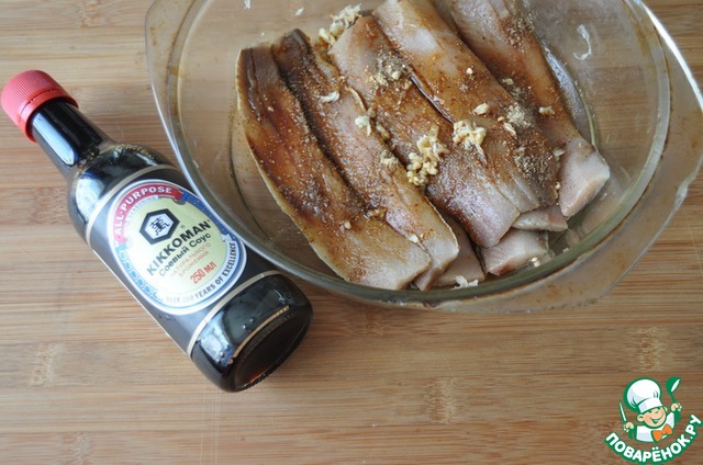 Поливаем соевым соусом, у меня ТМ Kikkoman. Хорошо натираем рыбу.