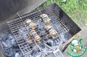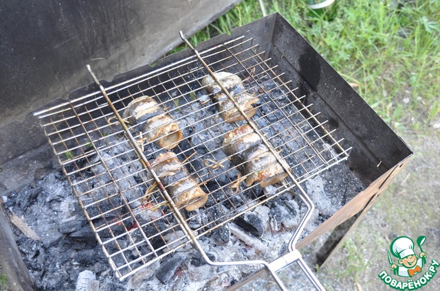 Запекаем рулетики из сельди, нанизав на шампур, или на решётке мангала на углях. Периодически переворачиваем решётку в процессе приготовления, чтобы рулетики равномерно запеклись до румяности с обеих сторон. Общее время около 20 минут.