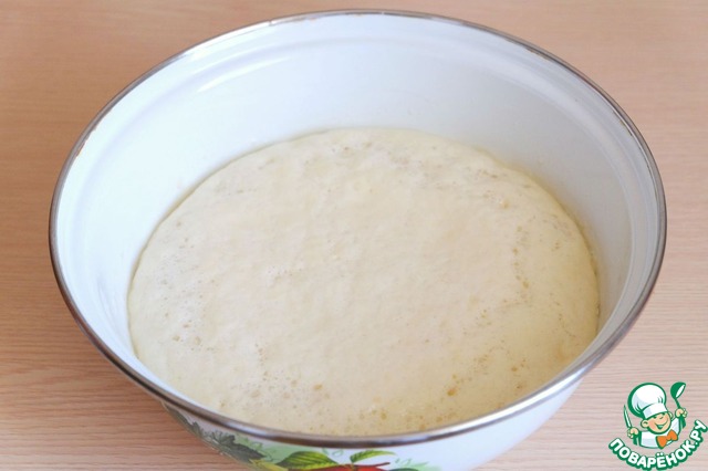 Добавить оставшуюся часть муки. Замесить тесто. Тесто накрыть полотенцем и поставить в теплое место для подъема.