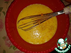 В миске побольше взбить желтки с сахарной пудрой и солью. Можно простым венчиком. К желткам добавить сметану и масло, взбить. Добавить цедру - взбить.