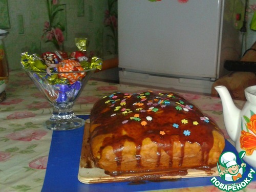 В ковшике на водяной бане растопить шоколад и молоко, добавить масло и все хорошенько перемешать. Залить остывший пирог. Но и этого мне показалось мало! В пакетике скучала кондитерская посыпка... Но я не дала ей скучать! Хы-хы)))