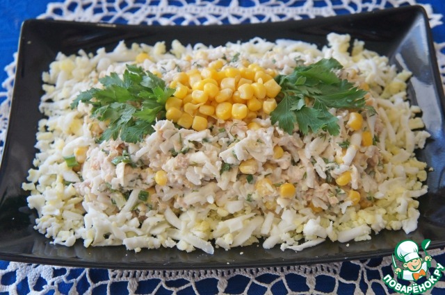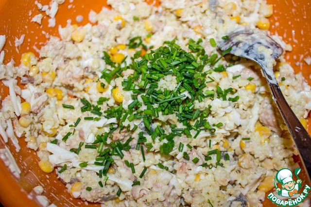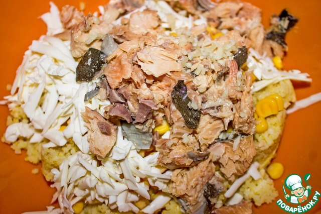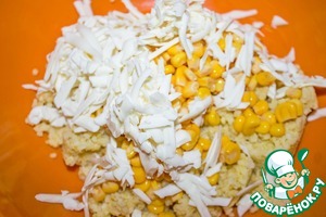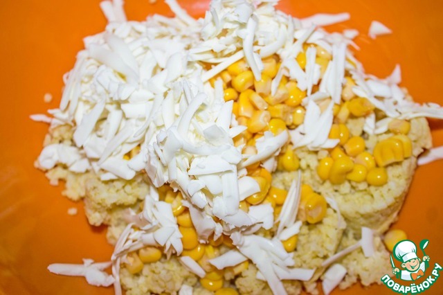 В глубокую миску выкладываем готовое пшено, кукурузу и тертый сырок.