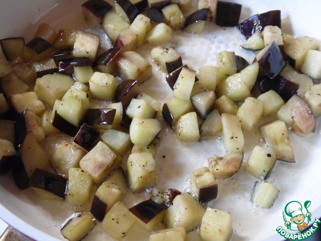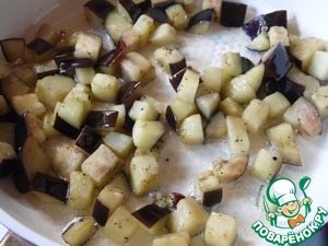 Баклажаны нарезать небольшими кубиками, обжарить на растительном масле, на небольшом огне 10 минут, периодически помешивая.