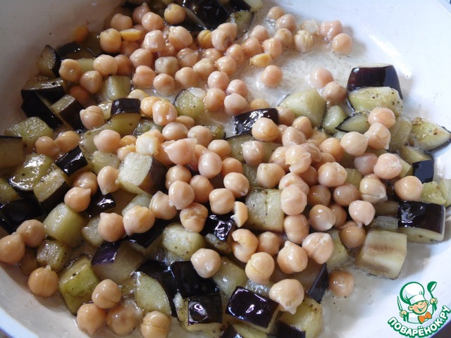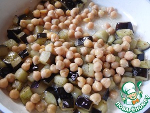 Из нута слить жидкость, нут выложить к баклажанам. Посолить, поперчить, готовить 5 минут.